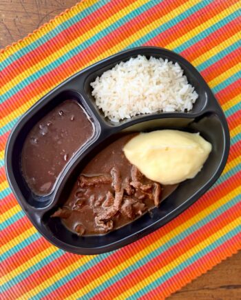 Cubos de Frango Grelhado com Purê de Moranga, Arroz e Feijão
